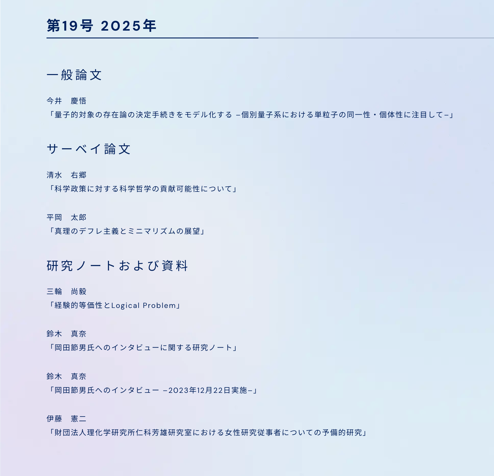 科学哲学科学史専修の紀要『科学哲学科学史研究』第19号が発行されました。 著者 科学哲学科学史専修 タイトル 『科学哲学科学史研究』第19号 出版社 京都大学文学部科学哲学科学史研究室 出版年月 2025年 出版社ページ