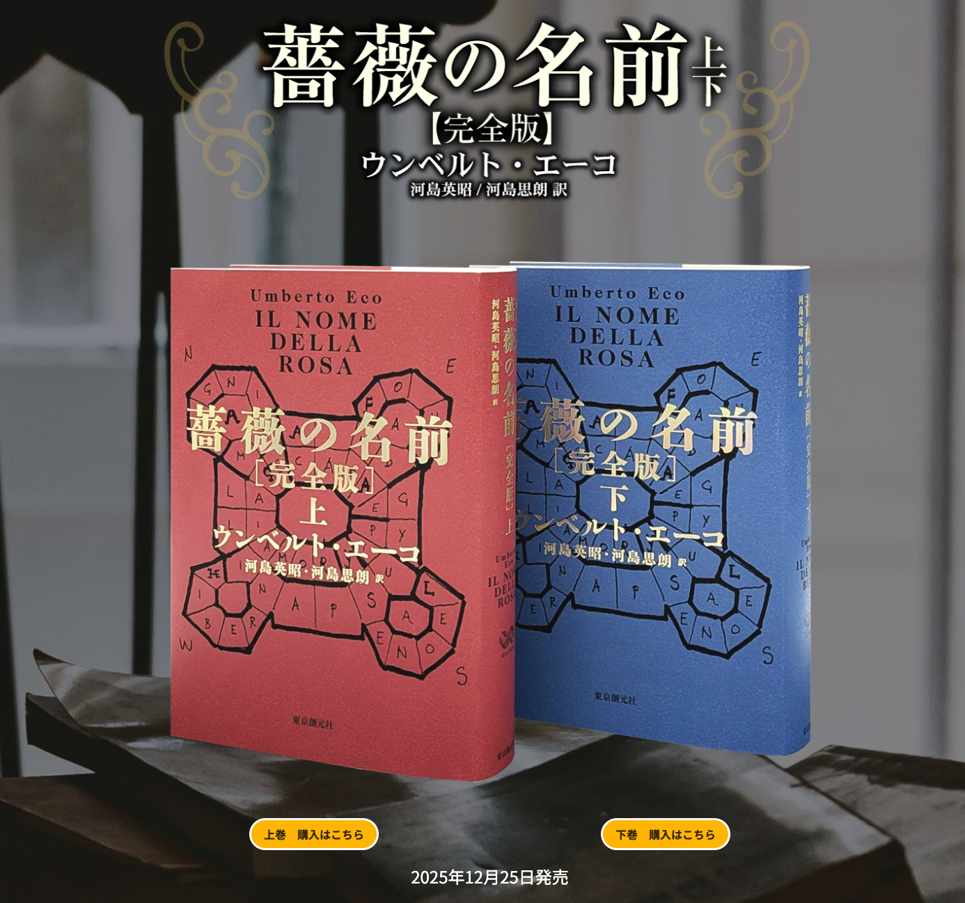 西洋古典学専修の河島思朗教授が共訳した、ウンベルト・エーコ『薔薇の名前[完全版]』〈上〉〈下〉(東京創元社)が刊行されました。 訳者 河島思朗 タイトル 薔薇の名前[完全版] 出版社 東京創元社 出版年月 2025年 出版社ページ